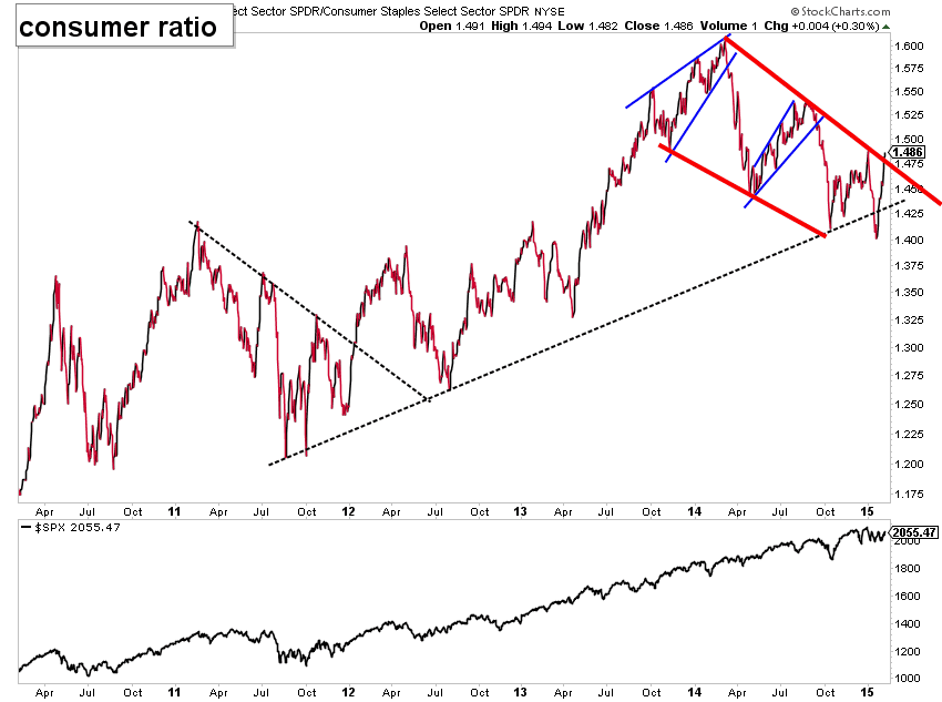 At the same time, the consumer ratio has ripped relentlessly after falsely breaking the trend from the 2011 lows.